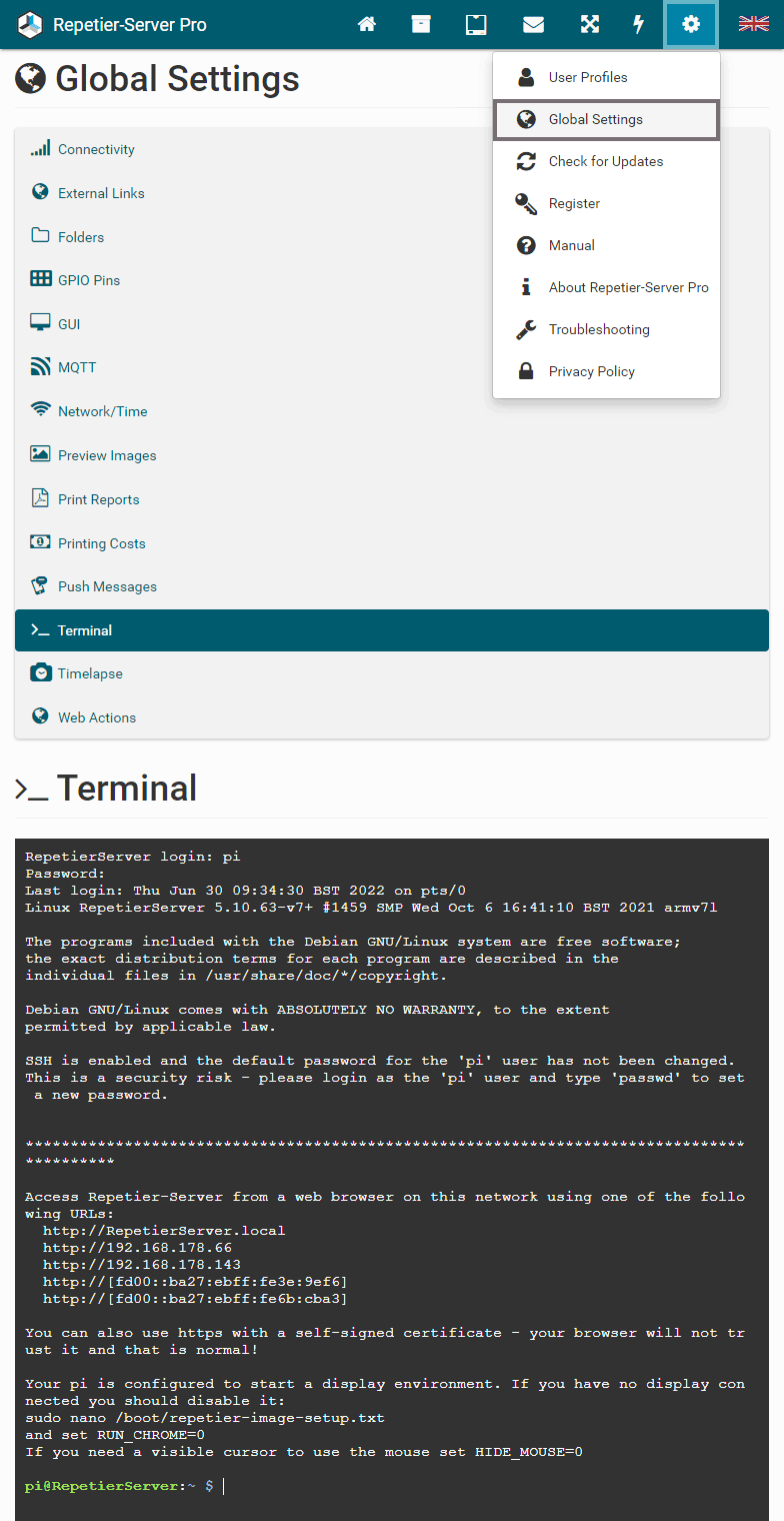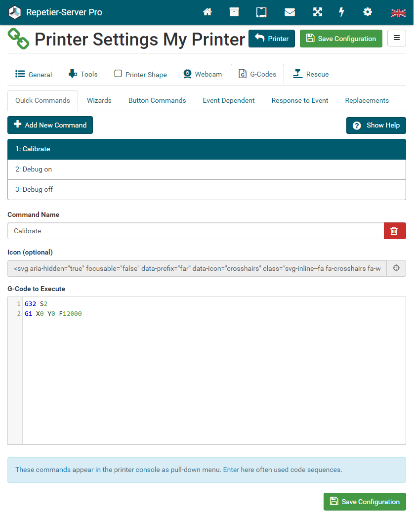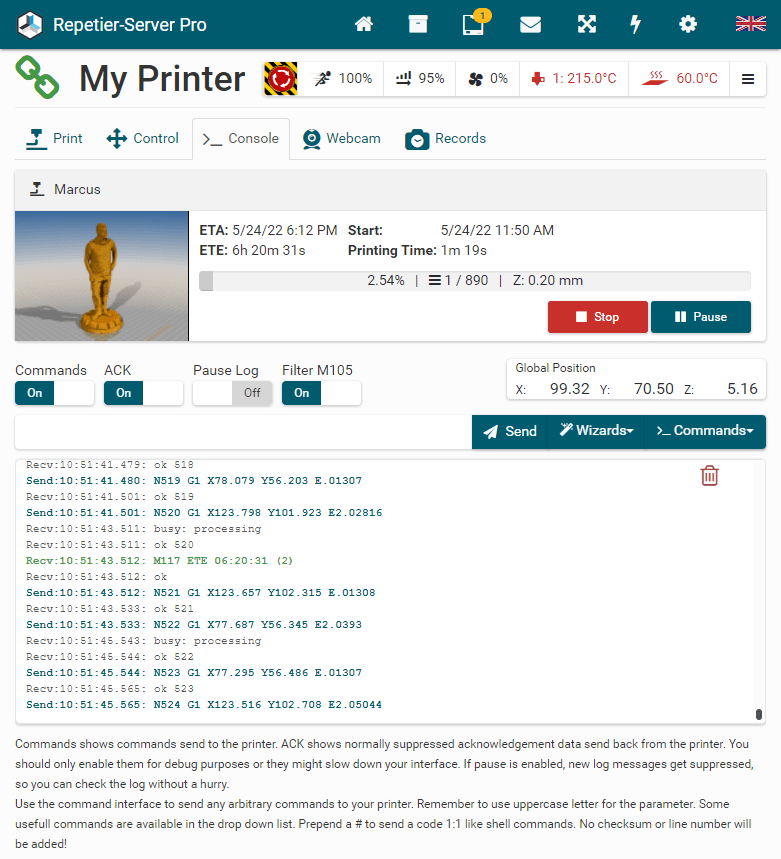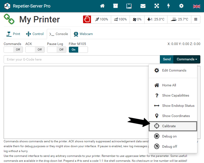 To start and stop Repetier-Server Pro, just enter Start Server or Stop