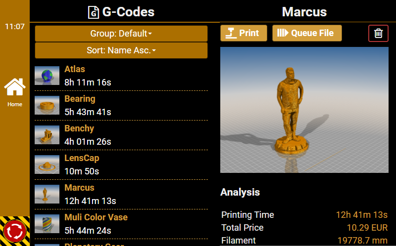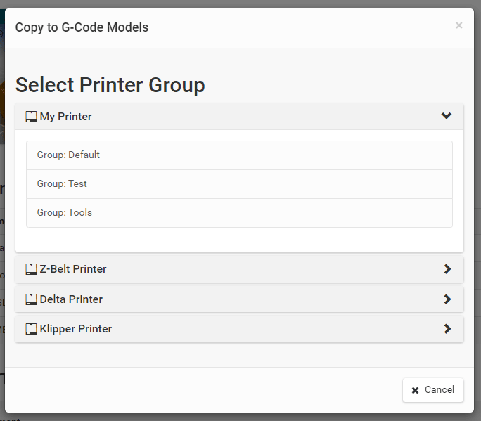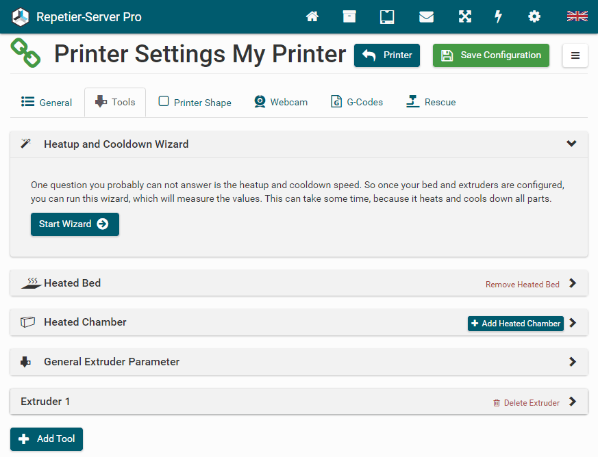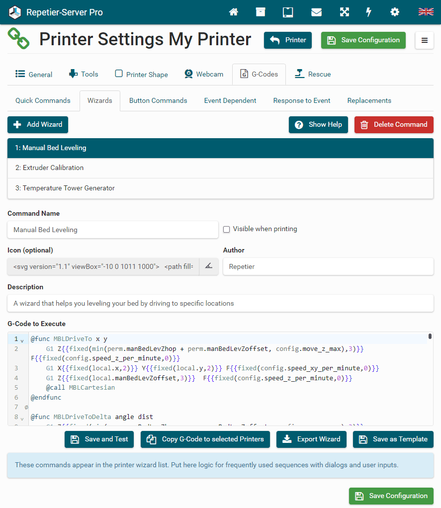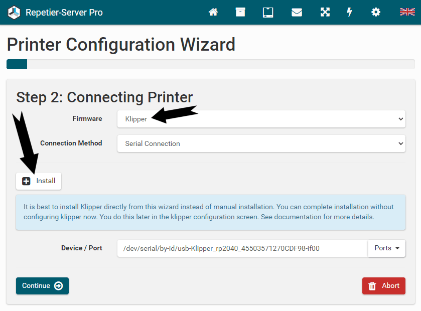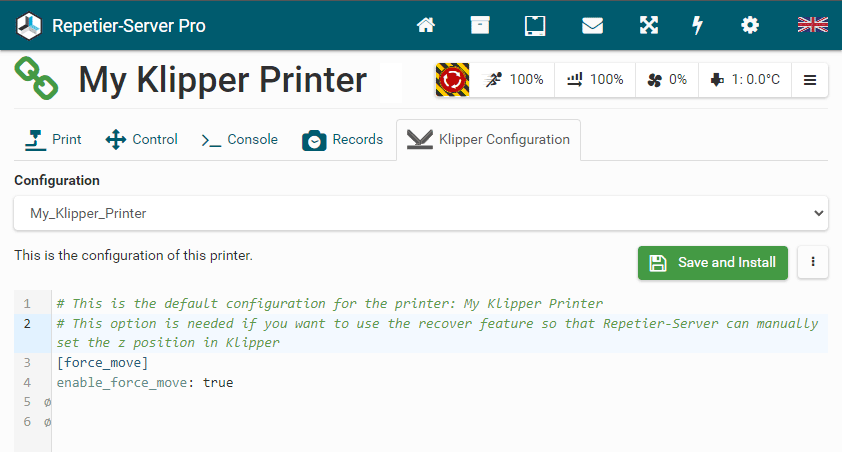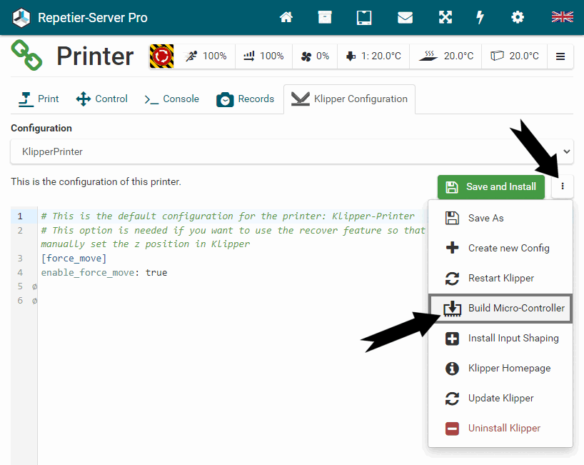 G0 X<xpos> Y<ypos> Z<zpos> E<epos> F<feedrate>G1 X<xpos> Y<ypos> Z<zpos> E<epos> F<feedrate>G4G10 S<1 = long retract, 0 = short retract = default>G11 S<1 = long retract, 0 = short retract = default>G20G21G28G29 S<0..2>G30 P<0..3>G31G32 S<0..2> P<0..1>G90G91G92G131G132G133G134 Px Sx ZxG201 P<motorId> X<pos>G202 P<motorId> X<setpos>G203 P<motorId>G204 P<motorId> S<0/1>M104M105M106M107M109M114M3M4M5M20M21M22M23M24M25M26M27M28M29M30 <filename>M32 <dirname>M42 P<pin number> S<value 0..255>M80M81M82M83M84M85M92M99 S<delayInSec> X0 Y0 Z0M104 S<temp> T<extruder> P1 F1M105 X0M112M115M116M117 <message>M119M140 S<temp> F1M163 S<extruderNum> P<weight>M164 S<virtNum> P<0 = dont store eeprom,1 = store to eeprom>M190M200 T<extruder> D<diameter>M201M202M203M204M205M206M207 X<XY jerk> Z<Z Jerk> E<ExtruderJerk>M209 S<0/1>M220 S<Feedrate multiplier in percent>M221 S<Extrusion flow multiplier in percent>M226 P<pin> S<state 0/1>M231 S<OPS_MODE> X<Min_Distance> Y<Retract> Z<Backlash> F<ReatrctMove>M232M233 X<AdvanceK> Y<AdvanceL>M251M280 S<mode>M281M300 S<Frequency> P<DurationMillis>M302 S<0 or 1>M303 P<extruder/bed> S<printTemerature> X0M320M321M322M323 S0/S1M340 P<servoId> S<pulseInUS>M350 S<mstepsAll> X<mstepsX> Y<mstepsY> Z<mstepsZ> E<mstepsE0> P<mstespE1>M355 S<0/1>M360M400M401M402M408 S<0-5>M450M451M452M453M460 X<minTemp> Y<maxTemp>M500M501M502M513M600M601 S<1/0>M602 S<1/0> P<1/0>M603M604 X<slowdownSteps> Y<errorSteps> Z<slowdownTo> T<extruderId>M908 P<<address> S<value>M999Repetier-Server Pro supports the guided installation of the firmware Klipper on your devices. To install Klipper, select the Klipper firmware during printer creation. The button Install appears. When you click this button, a menu appears that installs all dependencies and installs Klipper properly. Note that the default path of the installation is not /home/pi/klipper as in a normal installation but /opt/klipper/SLUG and this directory belongs to the user "repetierserver" and is therefore not accessible with the user pi.