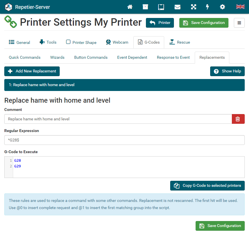 Before we continue describing some use cases, you should know great page for testing and alanysing regular expressions. When you call https://regex101.com/, you can write and test your own expressions, to see what they do. Current we use the PCRE library (PHP < 7.3). So select that library as regex variant and you should get the same results as Repetier-Server Pro. To understand what we describe here, it would be best to open the tool and test the examples and play with them. The tool also offers help to possible commands, so anything not mentioned here can be read there. Our expressions are normally tested with case-insensitive flag set!