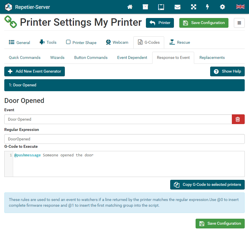 by the match. In this example we take the "Response to Event" tab of the printer configuration. When