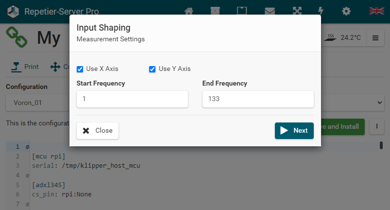 The input shaping settings page will appear where you can enter the frequency range and the axes to